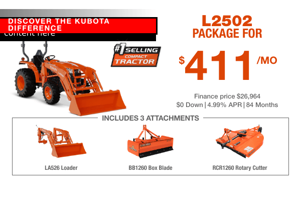 TAKE ADVANTAGE OF OUR EXCLUSIVE OFFERS ON SELECT KUBOTA PRODUCTS.